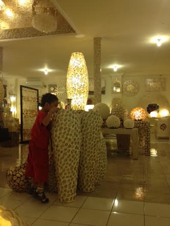 Matahari bersinar dengan teriknya hari itu di Cirebon. Padahal berdasar info beberapa teman, kota Bandung dan Tangerang Selatan diguyur hujan dengan deras. Tuhan sungguh baik. Kunjungan berikutnya, adalah kerajinan kerang, tepatnya di CV. Multi Dimensi yang berlokasi Jalan Ki Ageng Tapa Ds, Astapada Cirebon. Jaraknya lumayan jauh dari Keraton Kasepuhan. Sekitar 40 menit dengan kondisi padat merayap. Sampai disana, aku terpana melihat showroom dari kerajinan kerang ini. Sangat indah dan tertata dengan cantiknya. Tempat tidur, sofa, lampu kamar, lampu hias, vas, aneka pajangan, bahkan tempat buah dan alas gelas pun ada disini. Para ibu langsung sibuk berfoto sana sini, sedangkan aku sibuk menfoto anakku yang ingin tahu ada apa dalam vas raksasa itu. Aku tidak bisa menikmati berada dalam showroom ini karena anakku sibuk bergerak kesana kemari dan kalau pecah aku harus mengganti kerugiannya. Rasanya deg-degan. Aku hanya membeli vas kecil dan tempat lilin sebagai kenang-kenangan. Di bagian pengepakan barang, aku tertegun melihat foto salah satu mantan presiden kita. Hehehehe…