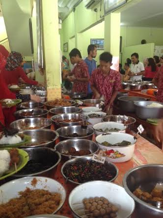 Setelah menempuh perjalanan hampir 4 jam, sampailah kami di kota Cirebon. Sayang sekali pada saat keluar pintu Tol, Cirebon belum siap menyambut para pengunjung kotanya. Kami langsung kena macet. Apalagi kami memakai bis ukuran sedang sehingga langsung terasa penuh. Untunglah kemacetan ini terbayar lunas pada saat sarapan di Warung Nasi Jamblang Khas Cirebon Ibu Nur yang berlokasi di Jalan Cangkring II. Kebetulan sekali warung ini dekat dengan stasiun kereta api. Jadi kalau naik kereta ke kota Cirebon, silahkan langsung menyantap hidangan di warung Ibu Nur. Dijamin bakalan ketagihan. Bagaimana tidak? Bayangkan berbagai menu lauk pauk terhidang di meja. Mulai dari limpa sapi, lidah sapi, paru sapi, hati sapi, cumi, udang, ayam, telor beraneka olahan sampai pepes tahu pun ada. Aku sempat bingung, mau makan lauk yang mana karena banyak begini. Akhirnya pilihan jatuh pada udang, paru goreng dan bakwan jagung goreng. Sebutan nasi jamblang ini karena penggunaan alas piringnya dari daun jati yang tentunya sudah dilap bersih 🙂 (sepertinya sih hehehe) Konon katanya supaya aroma masakan menjadi lebih wangi. Jangan khawatir dengan harganya ya, lumayan terjangkau. Misalnya nasi putih (ukuran nasi kucing angkringan) Rp. 1,500 perbuah. Aku sarankan pesan nasi minimal 2 biar kenyang karena sekali salah pesan, bersiaplah mengantri lagi dan antrian itu sangat panjang hehehehe…..