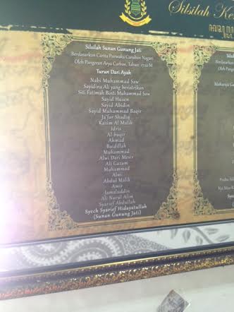 Puas makan nasi Jamblang, perjalanan dilanjutkan ke Istana Kasepuhan Cirebon (Keraton Kasepuhan). Disinilah Syech Syarief Hidayatullah atau lebih dikenal dengan Sunan Gunung Jati bertahta (1479 – 1568) . Aku sempat menfoto silsilah Sunan Gunung Jati yang konon merupakan keturunan langsung dari Nabi Muhammad Saw. Aku tidak bisa mengeksplorasi istana ini karena anakku sudah kepanasan dan dia minta ditemani duduk di bawah pohon padahal di depan kami ada museum kereta. Pelan-pelan kurayu anakku untuk masuk dalam museum kereta Singa Baron karena info dari Ibu-ibu PKK didalam museum kereta itu ada lukisan tiga dimensi. Aku penasaran melihat lukisan itu. Lukisan Prabu Siliwangi yang dilihat dari samping kelihatan tinggi, dilihat dari depan ternyata pendek. Kemudian ujung jari kakinya akan bergerak menyesuaikan posisi kita. Misalnya kita lihat lukisan dari samping, jari kaki akan menghadap ke arah kita, demikian juga jika kita melihat dari depan, jari kaki juga menghadap depan. Hal yang sama berlaku pada mata Prabu Siliwangi. Kemanapun arah kita melihat, mata Prabu Siliwangi akan bergerak mengikuti. Menarik kan?? Pasti penasaran ya? 🙂 Sayangnya aku tidak sempat menfoto lukisan itu karena mengejar anakku keluar museum. Dia memang tidak suka museum karena gelap katanya. Aku juga heran mengapa museum-museum kita minim pencahayaan ya?