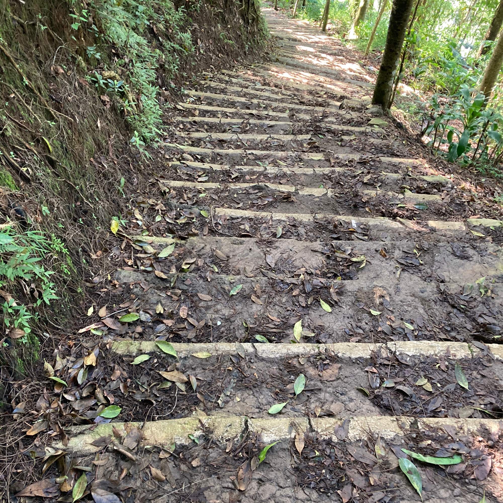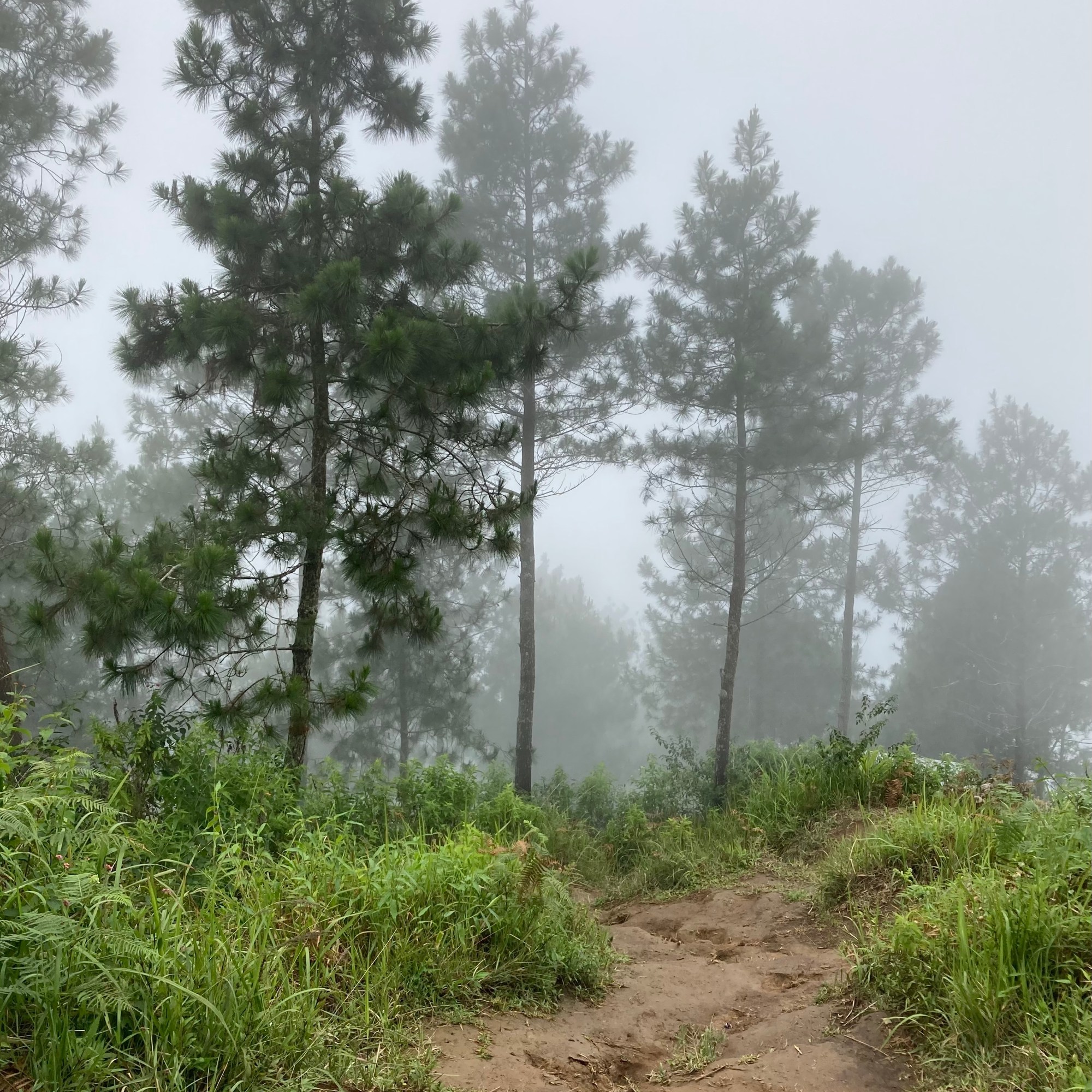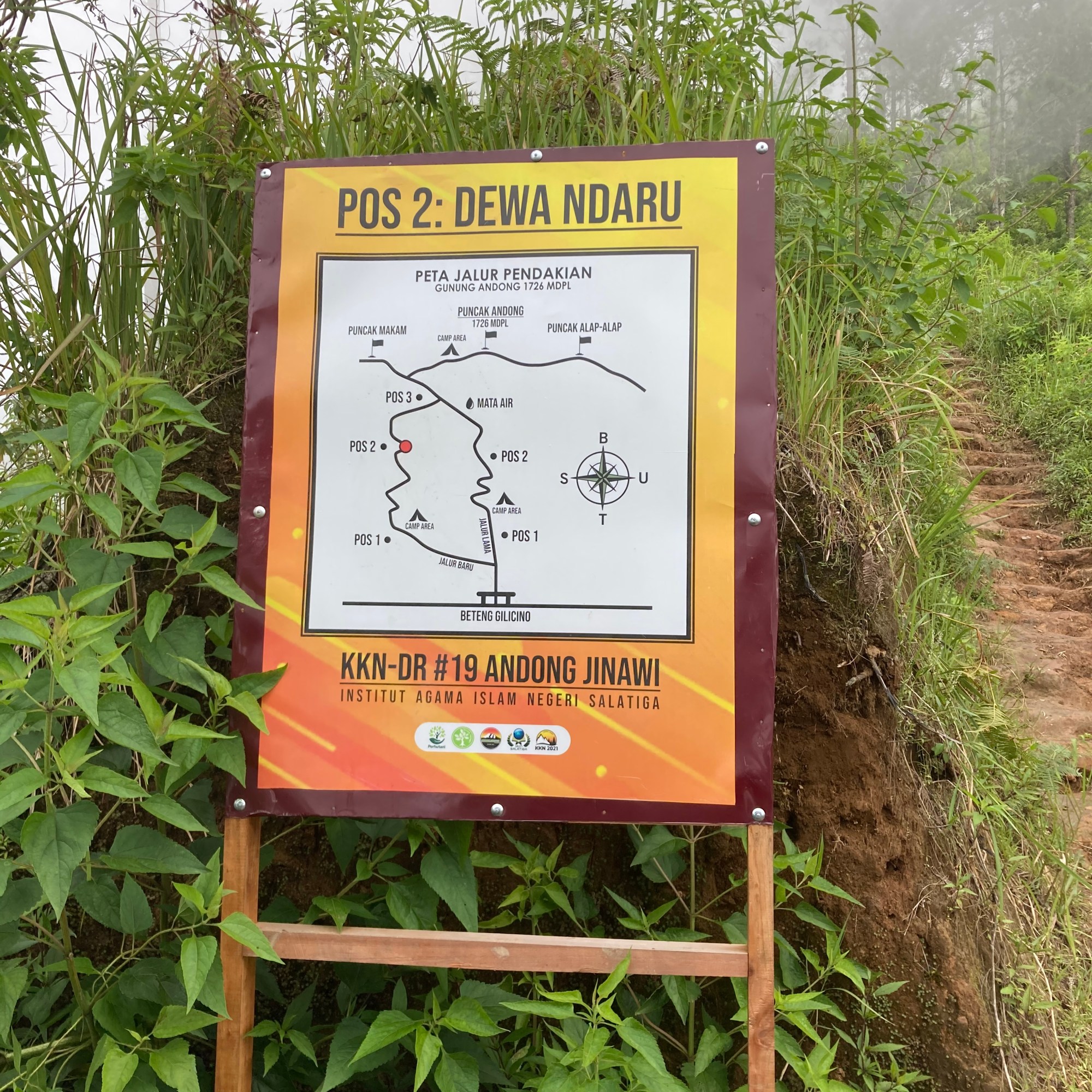 Aku bertanya? Apakah aman meneruskan perjalanan dalam kondisi kabut pekat begini? Mereka menjawab, aman. Karena jalur pendakian tidak tertutup. Hanya pemandangan di sekeliling tidak terlihat. Kami masih berteduh di Pos 3 hingga ada dua pendaki lagi turun dan tersenyum kepada kami. Aku bertanya bagaimana kondisi di atas? Apakah warungnya masih buka? Ternyata masih dan mereka memberikan semangat pada kami. Aku bertanya berapa lama lagi mendaki sampai puncak? Mereka menjawab sekitar 15 menitan berjalan tanpa berhenti. Bapak dan suamiku geleng-geleng kepala melihat kepanikan dan kekhawatiranku yang berlebihan. Semangat dan nyali tidak sebanding. Ketahuan… Si ketua rombongan ternyata ketakutan. Setelah hujan reda, kami memutuskan melanjutkan pendakian pelan-pelan mengingat yang terlihat di depan mata hanya jalur pendakian. Jalan naik berliku namun tidak seseram perjalanan Pos 2 ke Pos 3 dimana beberapa titik menunjukkan bekas longsor.