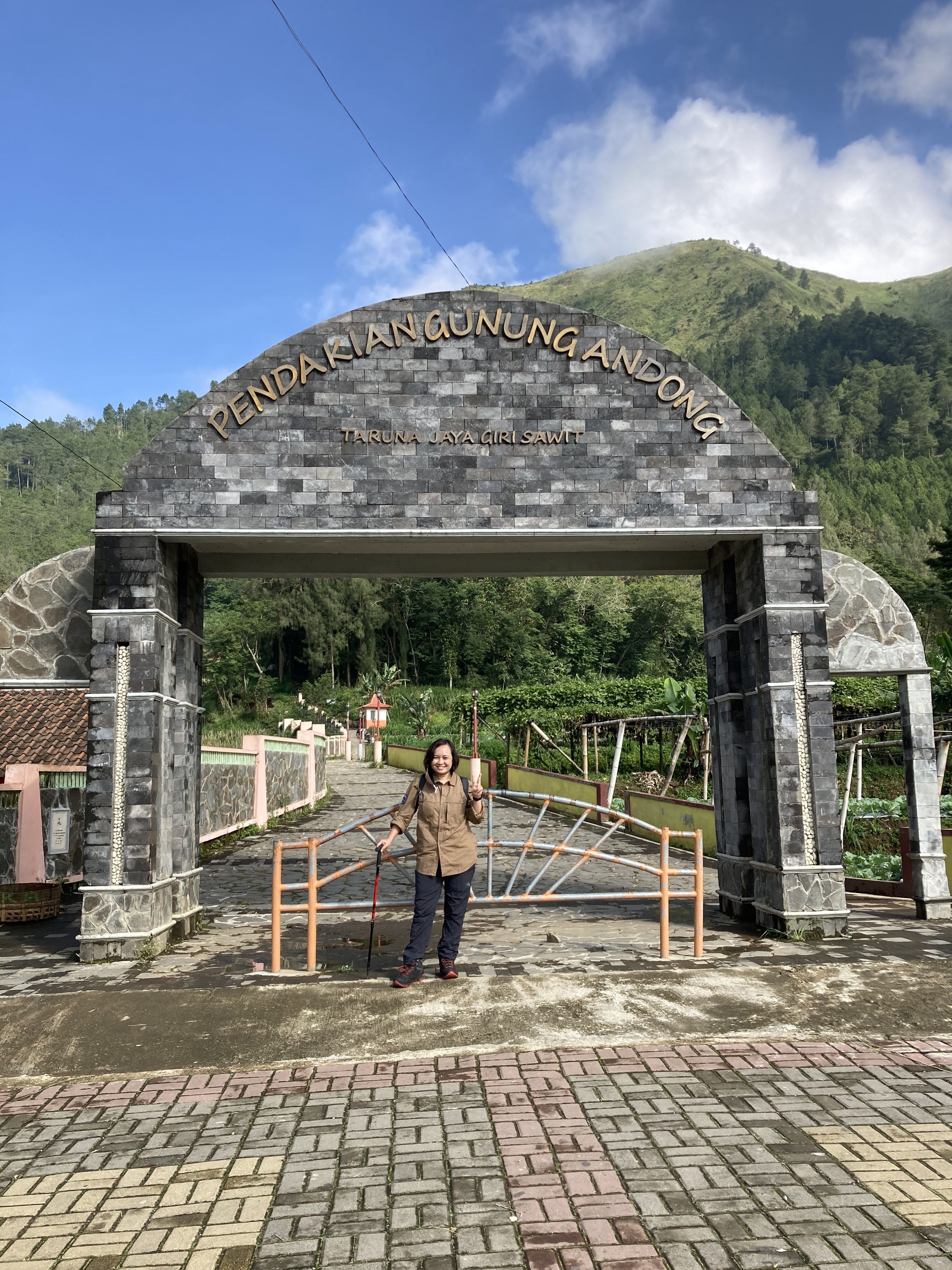 Awal pendakian kami begitu bersemangat karena cuaca cerah dan matahari menunjukkan sinarnya. Perjalanan menuju Gerbang Gunung Andong melewati area rumah dan ladang penduduk. Begitu memasuki gerbang, kami langsung disambut anak tangga. Menuju ke Pos 1, kami dihadapkan pada persimpangan untuk memilih melalui jalur lama atau jalur baru. Aku memilih jalur baru yang ternyata … lebih jauh pake banget! Hiks hiks…. Jalur baru memang cenderung landai tapi beneran bikin deg-degan karena langsung melihat jurang di tepi jalur pendakian.