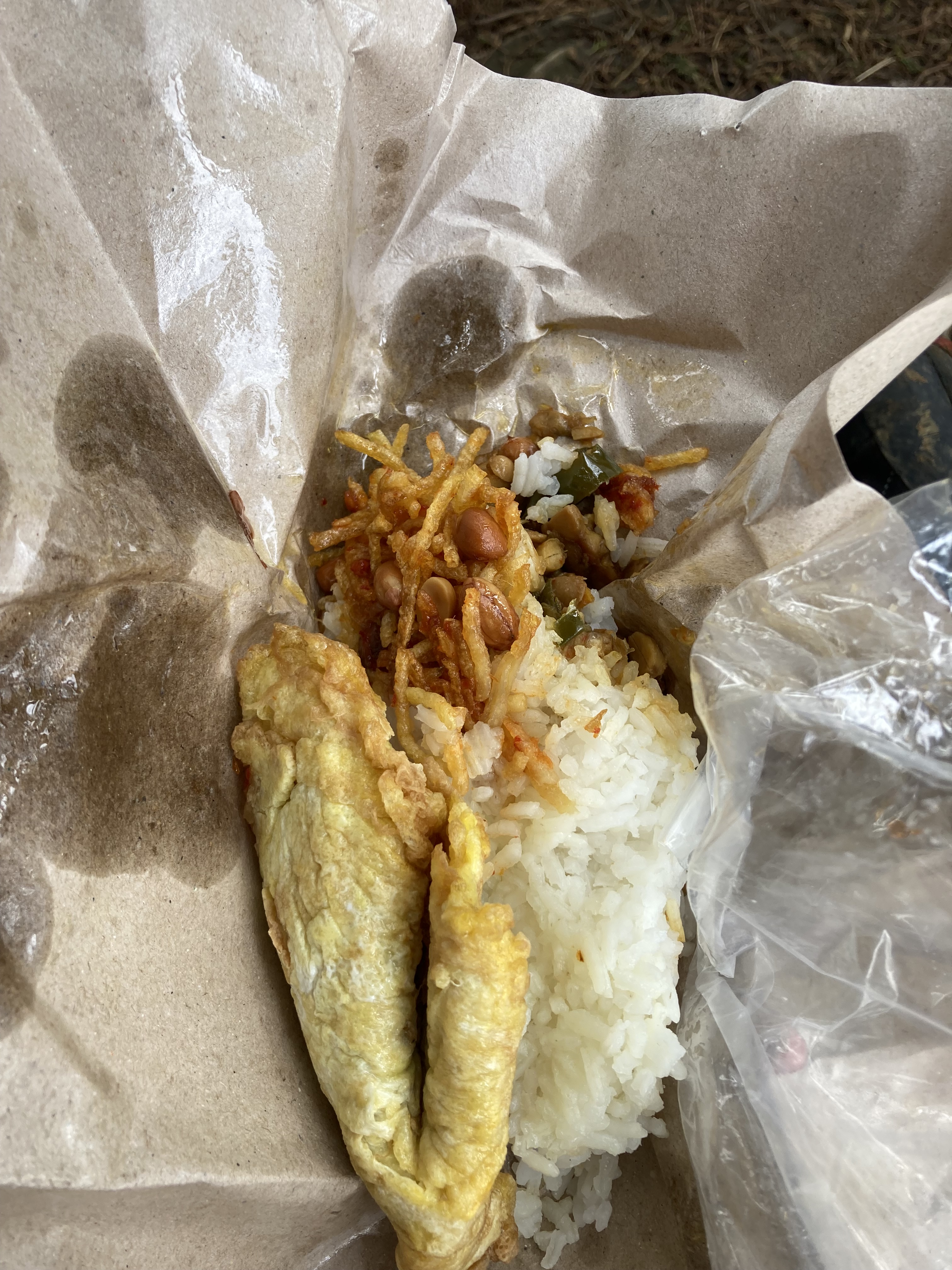 Berbekal nasi bungkus yang kami beli di basecamp, kami tidak lupa membawa jas hujan. Ingat pembaca, adalah suatu kewajiban membawa jas hujan pada saat pendakian meskipun orang bilang cuaca panas atau musim kemarau. Karena saat berada di gunung, hujan bisa turun sewaktu-waktu tanpa mengenal musim. Benar saja kami mendaki cuaca cerah, langit biru namun saat menjelang sore dalam perjalanan turun kami diguyur hujan deras.