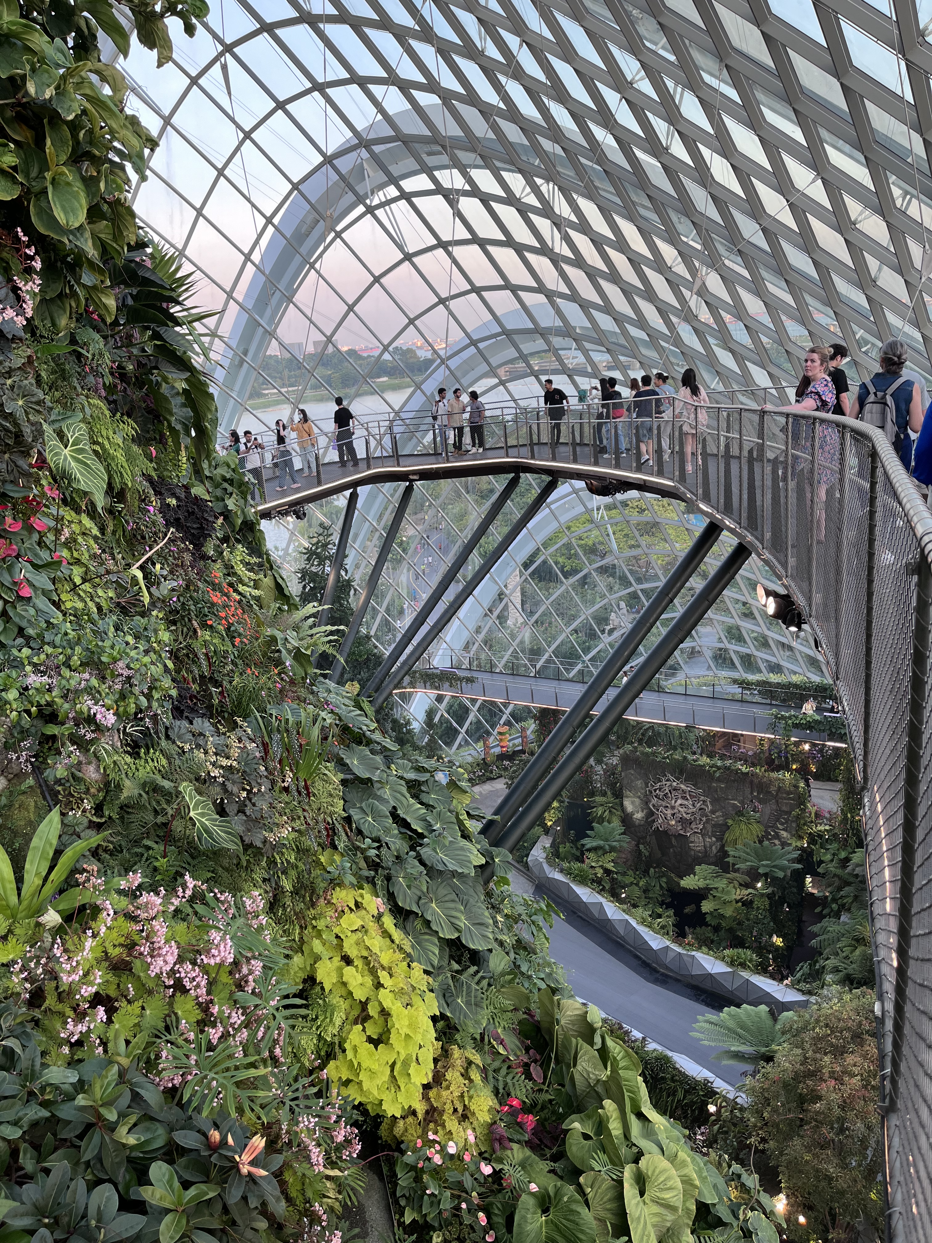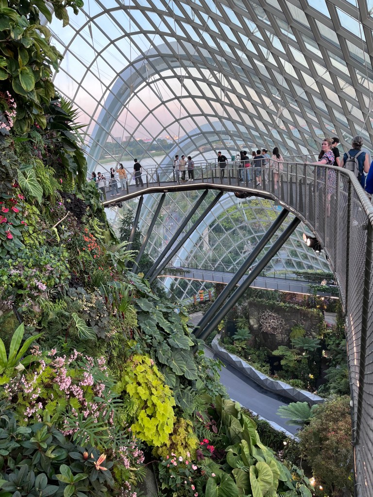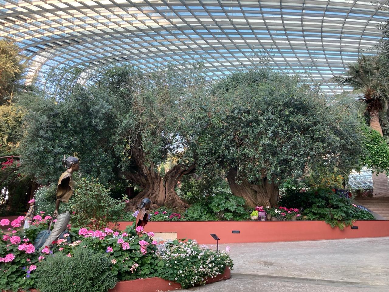 Menjelang sore hari, kami melanjutkan perjalanan menuju Gardens By The Bay. Gardens by The Bay terdiri dari dua tempat terkenal yaitu Flower Dome dan Cloud Forest. Flower Dome adalah sebuah kubah raksasa yang di dalamnya berisi aneka ragam tanaman bunga dari seluruh dunia. Tanaman ini hidup dan dilestarikan. Di sini adalah pusat memori keindahan aneka bunga yang bisa pembaca lihat dan sentuh. Bagi pembaca yang hobi tanaman bunga, ini adalah surga. Setiap musim atau period, Flower Dome memiliki tema tersendiri. Jika pembaca mengunjunginya di bulan Desember, maka pernak-pernik natal akan menghiasi seluruh penjuru. Pertama masuk gerbang FD, pembaca akan diajak menyusuri aneka tanaman bunga dari Asia, Afrika, Amerika Selatan, dan Eropa. Harum semerbak bisa tercium ketika melewati bunga tersebut.