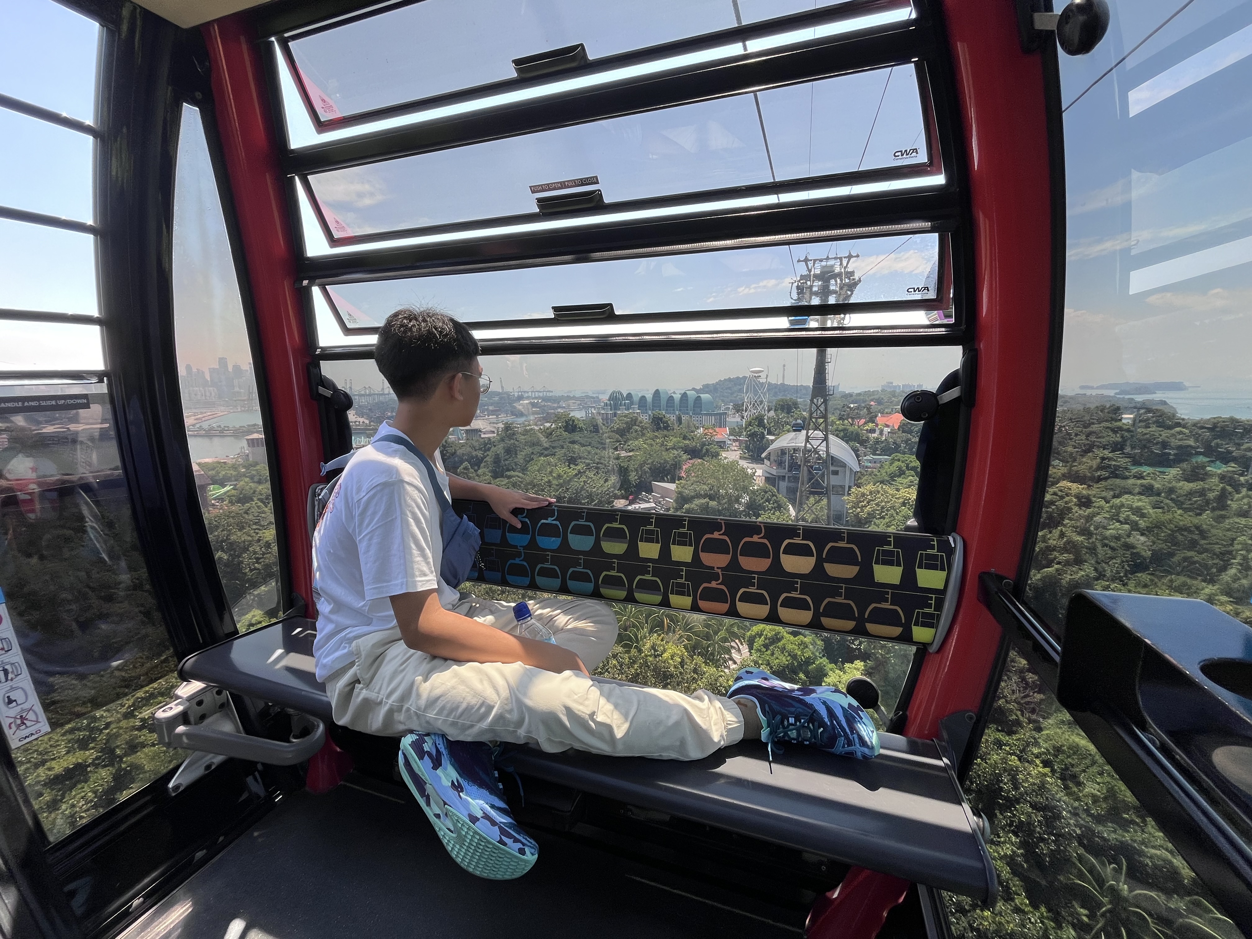 Jadwal untuk hari berikutnya adalah Pulau Sentosa dan Gardens By The Bay. Kami menyarankan pembaca untuk pergi ke Pulau Sentosa dulu di pagi hari kemudian baru ke Gardens By The Bay (Gbtb) di sore hari supaya bisa menikmati pertunjukan supertree di malam hari. Ketika itinerary dipegang anak remaja, aku semakin mengenalnya. Kami mengikuti dia naik gondola dari ujung sampai ujung (bolak-balik). Aturan adalah selama pengunjung tidak keluar dari gondola, dia diizinkan naik sepuasnya. Untungnya sepi kalau ramai sudah terbayang kami bakal dipelototin antrian pengunjung karena tidak keluar gondola. Setelah puas, kami menaiki kereta mobil gratis untuk wisatawan mengelilingi Pulau Sentosa.