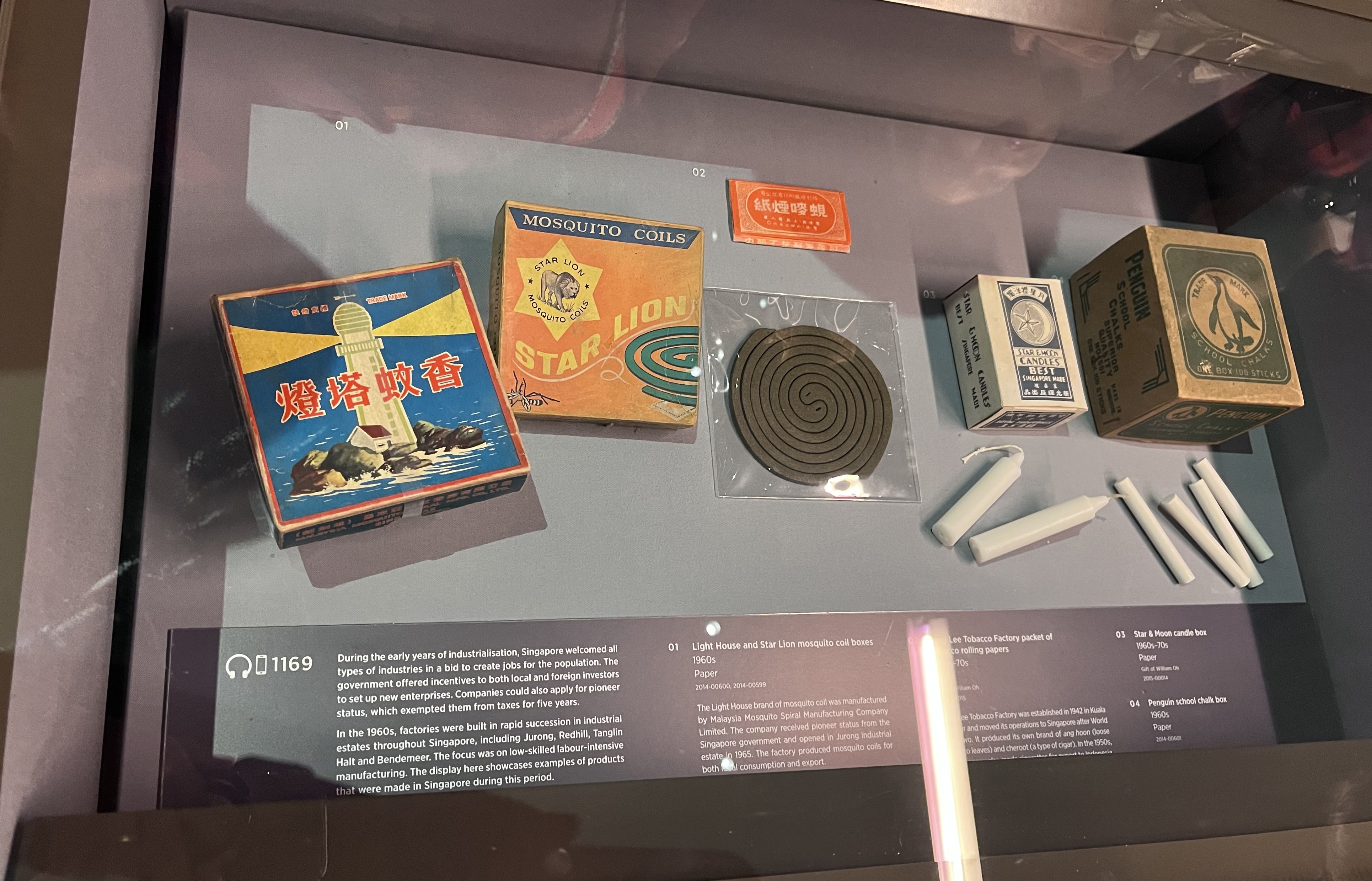 Cerita selanjutnya adalah di tahun 1960an, saat itu Singapura memiliki banyak tenaga kerja namun minim keahlian. Pemerintah mengambil langkah untuk mengatasi pengangguran. Dengan membuat pabrik lilin dan pabrik obat nyamuk untuk menyerap ribuan tenaga kerja tersebut. Pembaca generasiku tentu masih ingat obat nyamuk berwarna hijau yang melingkar-lingkar berbentuk spiral dengan bau menyengat dengan tujuan mengusir nyamuk. Nah kedua pabrik inilah yang menyelamatkan ekonomi sehingga kedua benda bersejarah ini bisa ditemukan di Museum Nasional Singapura sebagai saksi sejarah perjalanan negara.